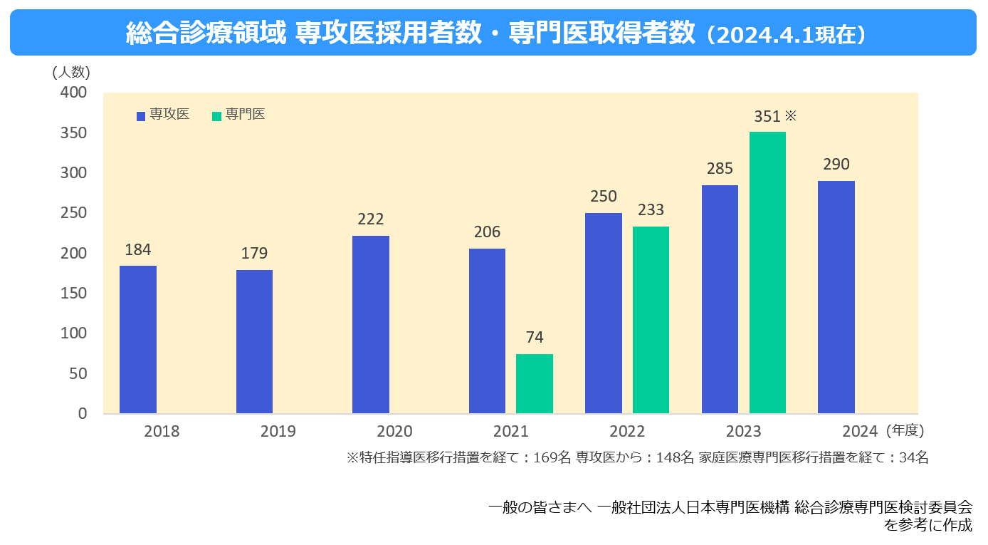结束医师临床研修的年轻医师,在专门医师制度中以“综合诊疗专门医师”为目标推进的研修项目 (专业项目) 的应征、录用人数逐年增加,2024年为290人。经过3年的研修,考试合格的专业医生在2024年4月时有658人。现状是数量还很少,但是综合诊疗专科医生今后肯定会增加。