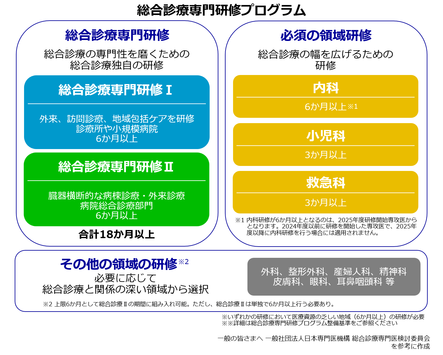 研修分为“综合诊疗专门研修I” (诊所和中小医院) 和“综合诊疗专门研修II” (医院的综合诊疗部门),分别要求研修6个月以上,合计18个月以上。