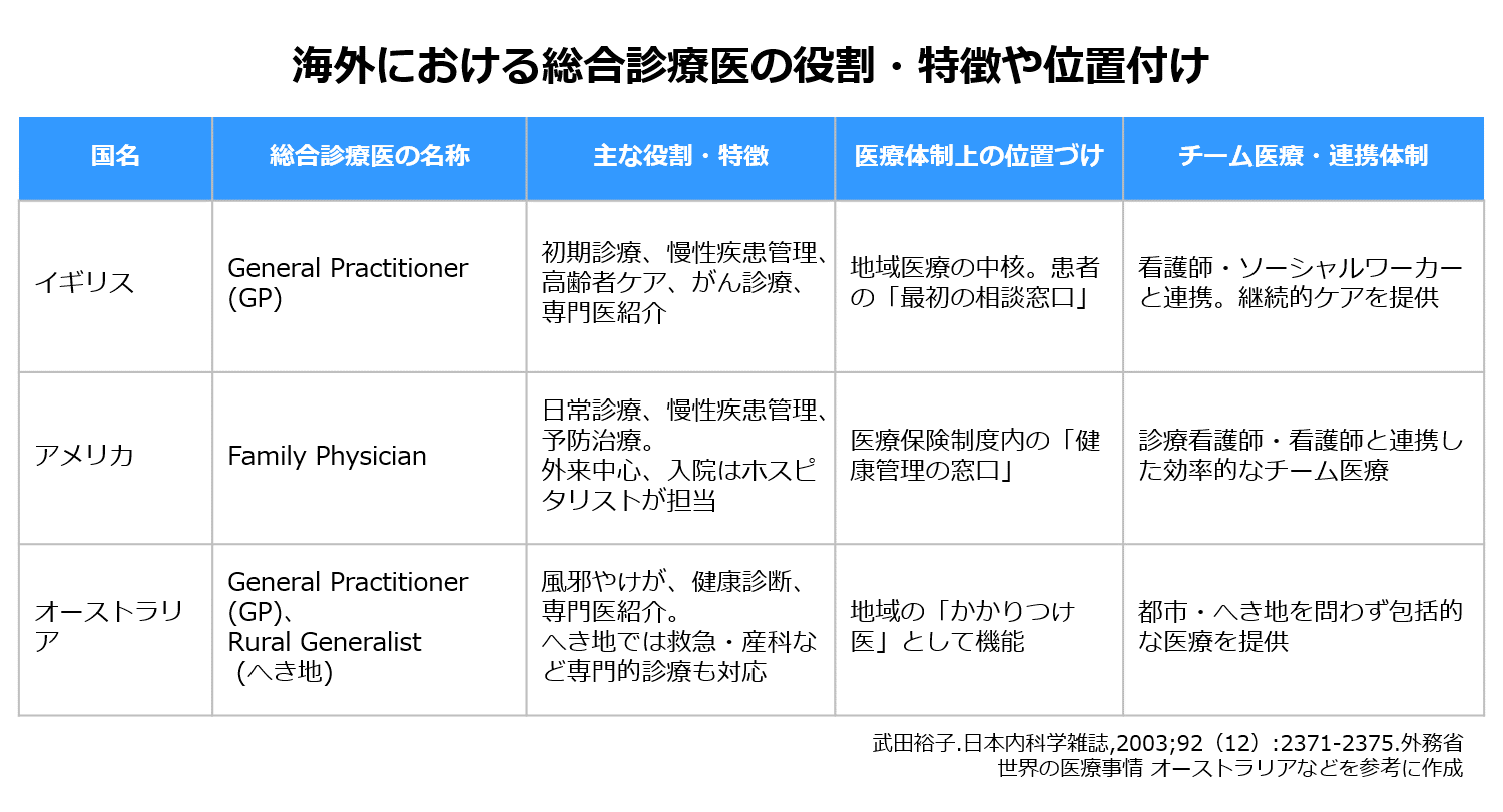 海外では、日本に先駆けて総合診療が医療制度の中で重要な役割を担ってきました。各国の医療体制において、総合診療医は地域医療の要として機能し、患者に対する初期対応から継続的な健康管理まで幅広く関与しています。