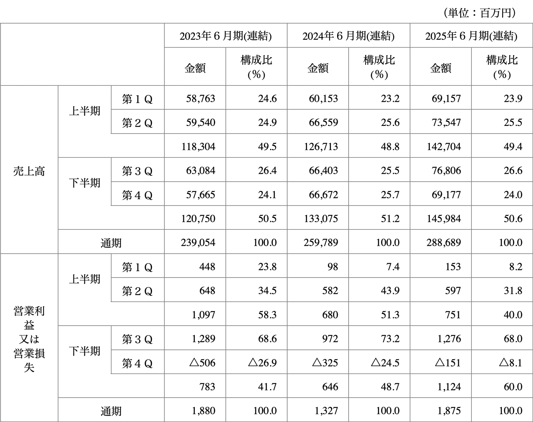 なお、2023年6月期から2025年6月期における各四半期の売上高及び営業利益又は営業損失の状況は、以下のとおりであります。