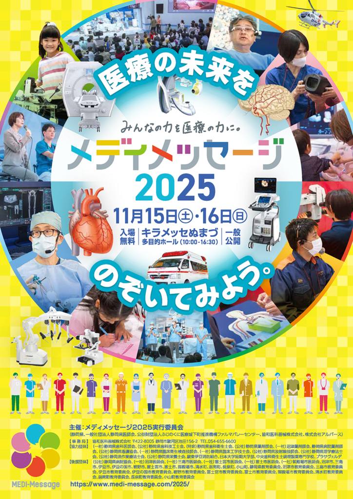 メディアスホールディングス株式会社(本社:東京都千代田区有楽町、代表取締役社長 池谷保彦)は、メディアスグループの協和医科器械株式会社(本社:静岡県静岡市駿河区、代表取締役社長 住吉進也)と株式会社アルバース(本社:東京都中央区日本橋、代表取締役社長 河野秀行)が参画するメディメッセージ2025実行委員会が、11月15日(土)、16日(日)の2日間、キラメッセぬまづにて「メディメッセージ2025」を開催することをお知らせいたします。