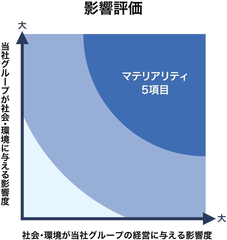 サステナビリティ委員会が中心となり検討を進め、取締役会で審議・承認を経て、マテリアリティを特定しました。今後は、持続可能な社会の実現と当社グループの持続的な成長を目指し、長期的な視野で持続可能な経営を推進するため、この重要課題を基盤としてサステナビリティ活動を進めてまいります。