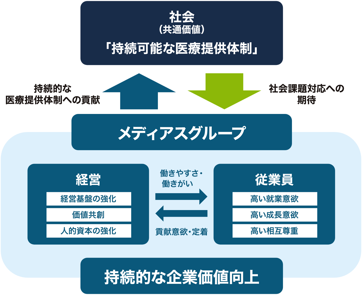 メディアスグループで働く一人一人が主体的に行動し、医療関係者、仕入れ先、地域社会、全ての関係者と手を取り合いながら、「誰一人取り残さない」平和で健康的な社会の実現をめざします。