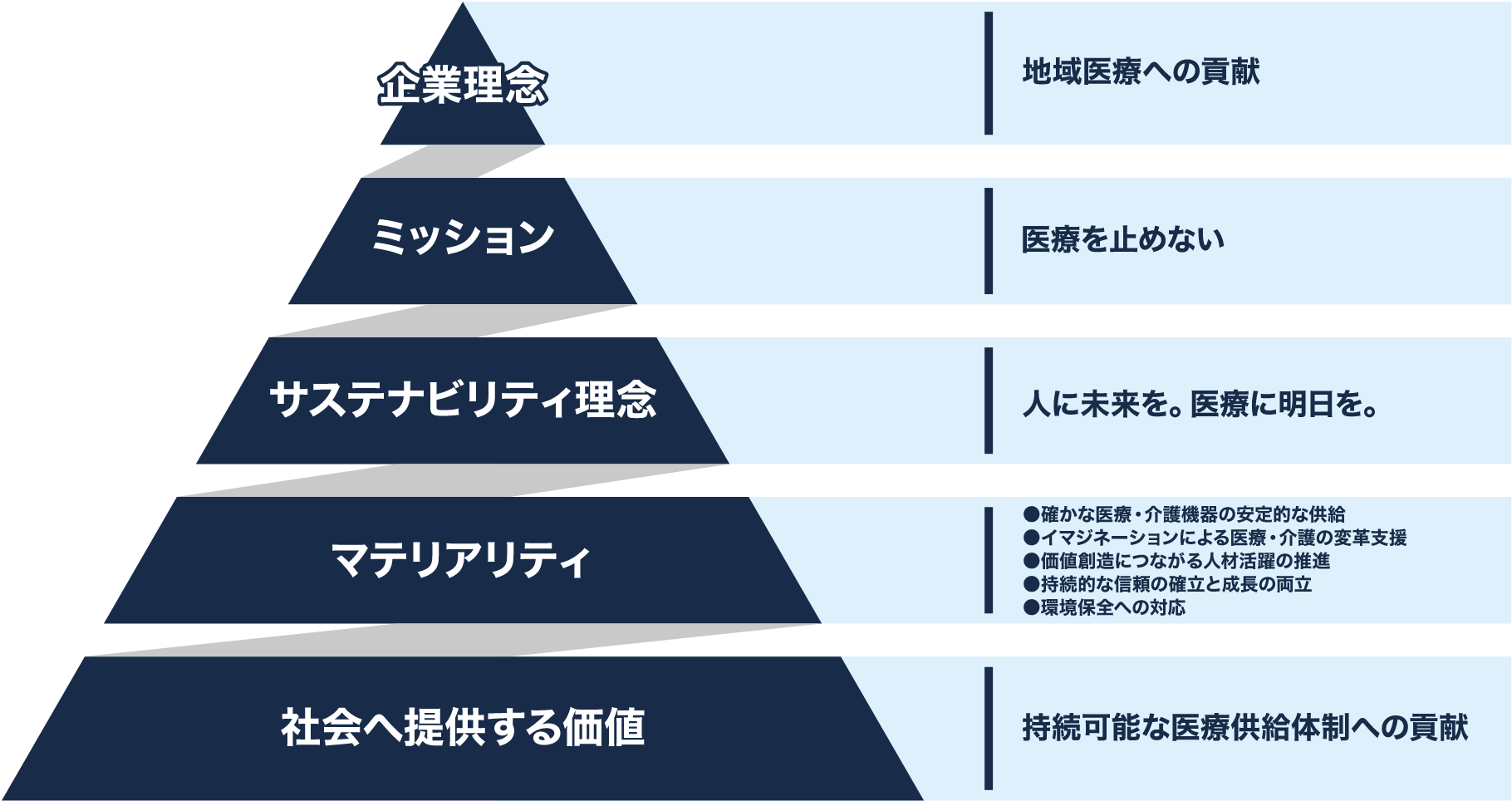 私たちの企業理念である「地域医療への貢献」は、事業活動にとどまらず、地域の人々の健康と安心を支えるという使命に根差しています。社会が急速に変化する中でも、常に信頼され、必要とされる存在であり続けることが私たちの責任です。これまで培ってきた地域医療への貢献をさらに進化させ、サステナビリティの視点と融合させることで、現在と未来の社会における課題解決に取り組んでまいります。